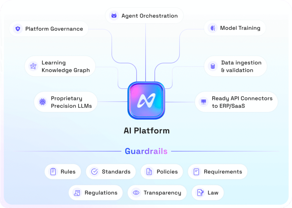 Open architecture AI platform built with proprietary precision LLMs, knowledge graph-based grounding, ready connectors to enterprise applications, and enterprise-grade reliability (ISO 27001, ISO 42001, SOC2 compliance).