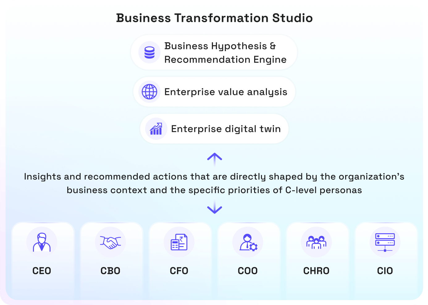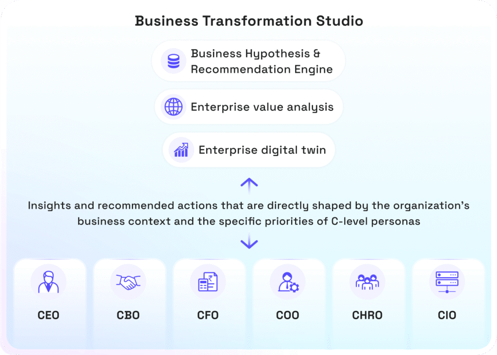 AI-powered business hypothesis and recommendation engine that integrates proprietary industry “Digital Twin”, CXO persona-based insight generation, and Enterprise Value Added (EVA)-based financial impact.